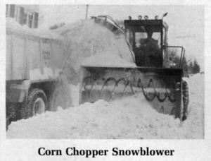 Corn chopper snowblower SNOWBLOWERS Snowblowers 10-6-6 Corn choppers make great snowblowers, says Walt Bentzinger, Jerome, Idaho, who along with his brother LeRoy mounted a 9-ft. wide blower unit on a Deere 5460 self-propelled forage harvester powered by a 225 hp. engine. They use the king-size blower to clear city streets.