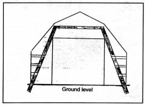He set pole barn type poles in the ground at an angle inside the barn with a cross bar at the top. Poles were spaced at 10 to 12 ft. intervals down the length of the barn. Then he ran 2 by 6's from the poles to the walls, nailing them in place at even intervals up the sides.