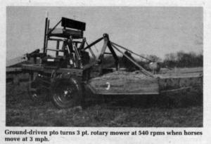 Several dozen small-tractor implements are available commercially (new or used) for mounting on the new horse-drawn hitch cart, including 5-ft. sickle mowers, 4-ft. rotary mowers, manure spreaders and fertilizer spreaders. The 3-pt.'s hydraulic pump can be powered manually or by a 12-V. battery.