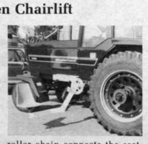 The pinion gear climbs up and around the stationary ring gear, lifting the arm up toward the tractor seat. To keep the seat level, the seat assembly is attached to a shaft and sprocket assembly that passes through the end of the lift arm. A roller chain connects the seat-leveling shaft and sprocket to the gear box.