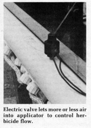 "Where weeds are thin, the tractor operator hits the control switch to close the valve. This creates a partial vacuum in the reservoir which restricts the rate of herbicide flow to the wicks, thus minimizing dripping on the crop below. Where weeds are thick, the operator opens the valve to speed up the flow rate and ensure adequate wetting of the wick," Dale points out.