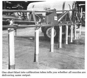 "You can tell at a glance down the line of hanging tubes whether the nozzles are delivering the same out-put. It quickly spots mismatched nozzles or plugged nozzles. Once nozzles have been cleaned or replaced so they all deliver the same output, the sprayer can be adjusted to the desired gallons per acre.