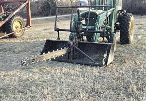 It consists of a hydraulic-driven 7-ft. long chain saw mounted on a steel frame that bolts to the bucket. Wangsness made the chain saw from scratch by bolting individual sickle sections to a length of heavy-duty chain off a haystack mover. Sections are spaced 1 ft. apart. The chain rides on a 2-in. thick, 6-in. wide steel tubing. A hydraulic motor chain-drives a sprocket at one end of the bar that drives the cutter chain.