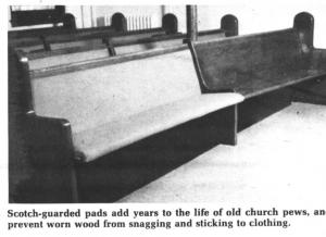 The pads have a 3/8-in. plywood base with 1 1/2 in. firm polyurethane foam on the bottom, and 1-in. at the back. "We suggest that the back of the pad be placed 1 1/2 to 2-in. lower than the top of the back of the pew to avoid soiling by the hands of people seating themselves behind," Arnold explains. The pad goes down and below the front edge of the old pew seat to prevent snagging on old rough edges.