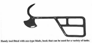 "The Little Farmhand" looks like a cross between an axe and a crowbar. It's about 16 in. long and has a large handle made from 7/16-in. dia. steel pipe. It's fitted with a small axe head on one side and a hook on the other.