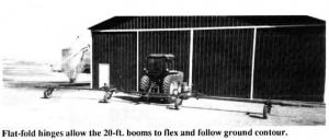 The 20 ft. main frame is made of 5 by 5 by 1/4-in. square tubing. Flat-fold hinges al-low the booms to flex and follow ground contour. Adjustable castor wheels are avail-able on the main frame as an option. Or, the 3-pt. rig can be used as a "suspended boom" without wheels. Boom height for broadcast or band spraying is adjustable from 15 to 30 in. Rear tongue hitch allows a large spray tank and trailer to be towed behind.