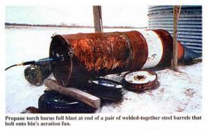 His torch burns full blast at the end of a pair of welded-together steel barrels that bolt onto the bin's aeration fan. A steady flow of propane is fed to the torch by a trailer-mounted LP tank.