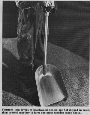 Individual shovels are made of 14 thin layers of beachwood veneer which are soaked in a special resin, then hot-pressed and molded into a one-piece shovel measuring 16 in. across the bottom. Individual shovels have wooden handles and a plastic hand grip.