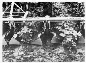 Hoods on the new-style sprayer allow Roundup and other herbicides to be sprayed in the growing crop without damaging the crop. It was conceived by Dr. Tom Jordan, assistant plant physiologist, and designed by Jim Reamer, agricultural engineer. The flexible hoods are designed with a simple bend (which makes them relatively easy to manufacture) and hinge both vertically and horizontally on a steel rod which connects them together. Fenders located in front lift plants up and over the hood to prevent plant contact with the herbicide being applied.
