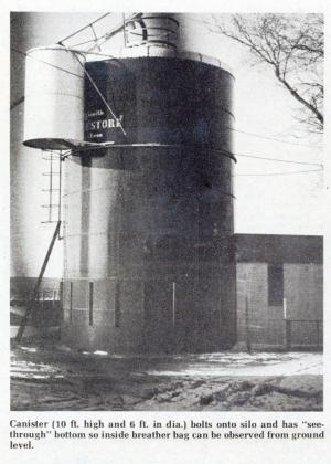 Size of the bag and canister is geared to size of the structure. For example, Thompson equipped his 21 by 30 ft. Harvestore with a canister 10 ft. long and 6 ft. dia. It weighs right at 600 lbs. He figures the structure, which held about 6,800 bu. with the original inside breather bag, now holds about 8,000 bu. with the bag removed.