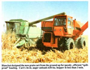 The first prototype made its appearance last year. "Custom combiners are ecstatic. It's something they've always needed. Because we carry the load rather than pull it, we eliminate `dead' axles on the wagons. It's much more maneuverable, and will work through the muddiest fields, leaving almost no tracks and causing minimal compaction. It'll unload the 650 bu. load in less than 3 min. with its 16-in. dia. auger. And it still works like a tractor. If the combine gets stuck, you can pull it out with the cart."