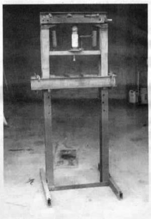 He cut out sections of the stalk cutter's I-beam frame and mounted them on stands made from other parts of the frame. The press's "work table" rests on a pair of steel rods inserted through holes spaced 6 in. apart on both sides of the press frame, so the table can be moved up or down as needed. A hydraulic jack rests on a strap iron "slide" that rides up and down in-side the I-beam sides of the press. A pair of springs are used to return the jack to its closed position.