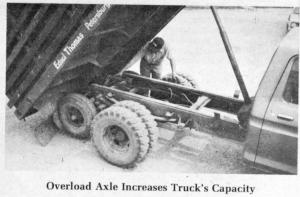 The add-on axle rides up free and clear of the road when the truck is empty. But, when the load gets down on the overload springs, the axle comes into contact with the road, making it possible to carry an extra 50 bu. of grain, or heavier livestock loads, in the one-ton truck.