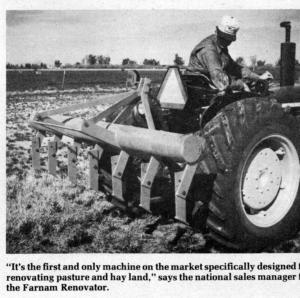 "It's the first and only machine on the market specifically designed for renovating pastures and hay land," explains Bill Remias, manager of sales for the new Farnam Renovator. "It doesn't rip or chisel but slices the soil. The idea is to open the soil for aeration and moisture penetration without disturbing the topsoil, thus minimizing erosion and loss of topsoil moisture through evaporation.