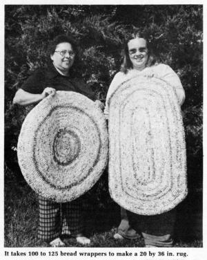 Freda cuts the bread wrappers into 1-in. strips, then folds and crochets them into rugs using a crochet hook. It takes from 100 to 125 bread wrappers to complete a 20 by 36 in. rug. Freda can complete one in about 2 1/2 days. "I work on the rugs at intervals throughout the day. Sometimes, I work on them as I watch TV, or listen to the radio. It just comes automatic to me as I crochet the breadwrappers into place," Freda points out.