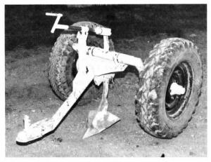 Heward used 2-in. dia. steel pipe and scrap iron to build the frame which mounts on a pair of 7.50 by 16 wheels off an old dump rake. A 2-in. dia. ball hitch mounts in front. He used pieces of 4 by 3-in. angle iron to make a V-shaped digger that's 10 in. wide and 8 in. high. It's welded to a shank that's raised and lowered by a hand-cranked threaded shaft.