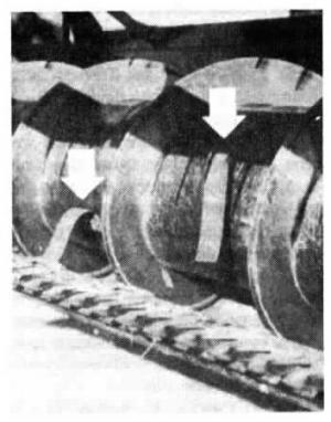 He cuts the rubber strips out of inner tubes, making them 3 in. wide and 12 to 13 in. long. He holds them in place with a 3-in. long piece of flat iron or angle iron bolted in place with 1/4-in. bolts. He drills and taps the auger tube to accept the bolts. Strips bolt between sections of fighting, with each strip 7 in. offset from the strip next to it.