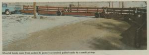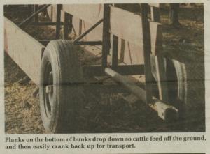 To set up the Porta Bunk for feeding, its plank bottoms are dropped to the ground, opening up the bottom of the feeder to make room for a load of hay or silage. To move the feeder, the operator simply cranks the bottoms up and drives away.