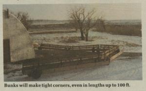 The new Porta Bunk is made from treated wood planks fitted to a heavy metal frame. Each 20-ft. section has an axle, outfitted with 14-in. tires, and a tongue that hitches to the bunk in front or to a tractor or pickup used to tow it.