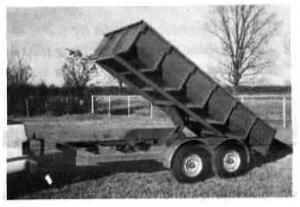 Tow-Behind Dump Trailer PICKUPS Accessories 17-4-37 We think we make some of the best tow-behind dump trailers on the market. We make several different types but they all run on the same principle - 12-volt hydraulic power. We can dump up to 30,000 tbs. off a 12-volt system. We recently came out with a 16-ft. bumper-pull trailer that sells for about $2,700. There's nothing like it on the market. No need for complicated hydraulics and, in many cases, it replaces an expensive truck and is much cheaper to maintain, operate, license, etc. We can customize with goosenecks, tandem axles, etc. Our biggest seller is a 3-yard bumper-pull. We also make a "strap on" dump box that you can fit to any flatbed with it's own self-contained 12-volt hydraulic unit. Prices vary depending on options but all are well-built because when we started building them, we were building them for our own use. We're looking for dealers all over the country. (Roger A. Johnson, North Shreve Welding & Construction, P.O. Box 78290, 5624 Hwy. 71N, Shreveport, La. 71107 ph 318 226-8581; fax 318 222-3436)