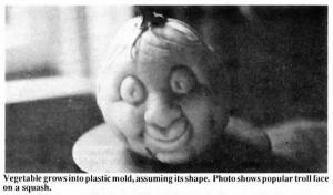 Vegiforms, as he calls them, consist of a 2-piece clear plastic mold that is secured over a growing fruit or vegetable while it's still on the vine. As the fruit or vegetable grows within the mold it gradually assumes the shape of the mold until it completely fills it. At that point, the mold halves are removed. If you harvest the living sculpture at that time, the face will hold its shape. If you let it continue to grow, the face will grow with the fruit or vegetable, but will stretch out the way a face on a balloon stretches out when you blow up the balloon.
