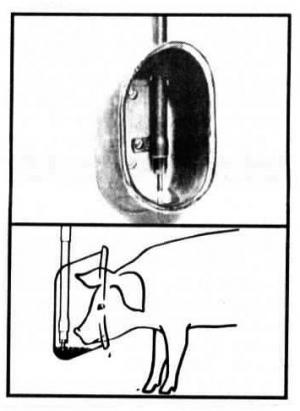 A Drik-O-Mat model for growing-finishing hogs sells for $46.50, and a smaller model for weaners for $38.50. Both models come with stainless steel nipple valves that adjust to deliver 1 to 5 quarts per minute.