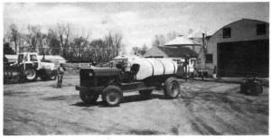 Minnaert cut away the cab and bed and overhauled the 6-cylinder engine, 4-speed transmission, and 4:10 rear axle. He cut apart the twin I-beam axles and raised them, then installed large 9.00 by 20 rear tires and 7.50 by 16 front tires. A belt driven by the engine's crankshaft powers the sprayer pump. A 500-gal. polyethylene tank is mounted over the rear axle just ahead of the 60-ft. Blumhardt boom.