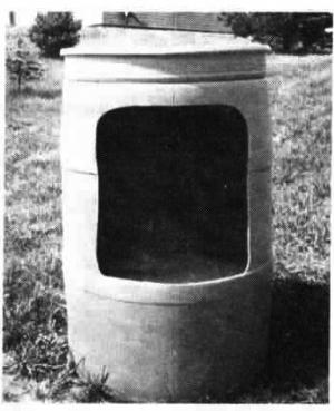 We cut a 15 by 17-in. hole in the side of a clean 55-gal. polyethylene barrel using a sabre saw . Then we fill the bottom 12 to 14 in. of the barrel with a high-strength mortar mix so that the upper surface of the concrete is 2 to 3 in. below the lower lip of the side opening. It makes a weather-shielded container with avery low center of gravity (weighs almost 200 lbs.) which stands up to bumping and jostling by livestock. The mineral supply always remains dry. The barrel is easily rolled onto the levelled lip of a loader bucket for transport or can be lifted by 2 men into a pickup bed if necessary. We position the feeder so that the opening faces the direction that's least likely to let in driving rain. With used polyethylene barrels selling for $5 to $10 and the cost of concrete at about $5 we find our units to be the most indestructible and inexpensive available. (Ronald R. Hutchinson, 650 S. Lincoln St., Augusta, Mich. 49012 ph 616 731-4960)