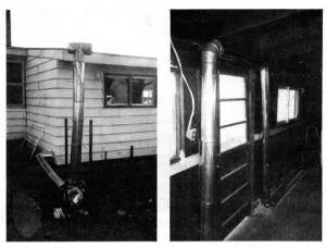 He wanted to heat both his garage and shop with wood but he didn't have a flue or a good way to move heat between the two buildings. His solution was to use a furnace blower to draw air through about 50 ft. of 6-in. pipe that runs from the stove - which is in the garage - through a wall to the shop and then outside.