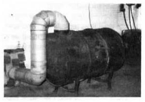 The blower sits outside the shop. The flue goes in the intake side of the blower and a vertical pipe with a cap on top is attached to the discharge end. To improve the draw of the blower, Harness covered the other open side of the blower.
