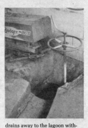 Mandrell poured a 6 by 6 by 6-ft. concrete pit at the end of his dairy barn and positioned below his barn cleaner. The top of the pit is sealed by a metal disc that he cranks into place from the inside with a steering wheel crank. The pit is pressurized by three air hoses that feed out of a small air compressor. One air hose comes up from the bottom of the pit to agitate it, one simply acts as a vent in case the pit door should ever need to be opened, and the other pumps in air at about 12 psi, which Mandrell says is plenty to force all the manure out the 16-in. dia. PVC outlet pipe to the lagoon in minutes. The lagoon is located about 100 ft. from the barn.