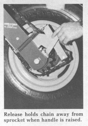 The release kit attaches to the drive sprocket. A half-moon shaped release slides in between the chain and the sprocket, suspending the chain so drive components stay at rest during transport. A spring-loaded release quickly flips the handle back down when you switch back to field position.
