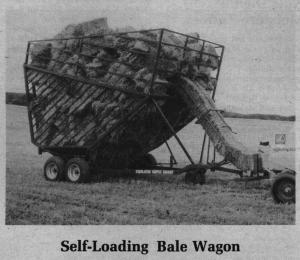 Individual wagons, depending on size, hold 50 to 210 bales. When the trailer is full, the tractor operator pulls a rope to trip the rear swinging endgate, which is hinged at the top. As the bales tumble out, the gate crawls over the pile, then swings back with enough force to self-lock and ready the trailer for the next load. Individual trailers are generally hauled to headquarters for dumping and stacking.