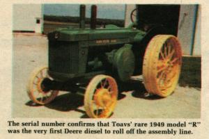 One of Toavs' most unusual tractors is his 1949 "R", which was the first Deere diesel tractor ever to come off the assembly line. He hauled it home himself from the factory in Waterloo just after it was built. Its serial number confirms the fact that it was the first one Deere ever sold.