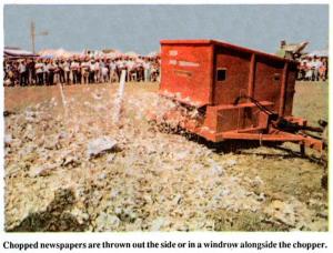 Handles up to 2,400 lbs. of bale or news-paper. It's 95 in. wide, 85 in. high, and requires only a 30 hp. tractor with a 540 pto. It's fitted with fixed knives. Material length can be varied by changing knives to hammers.