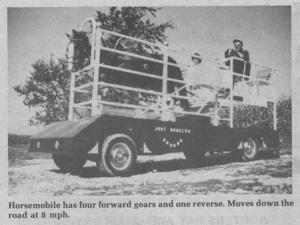 You've never seen an attention-getter like the "horsemobile" Dick Frey, Forest, Ohio, built to take to parades and shows, and just for horsin' around. The "engine" in Frey's creation is a draft horse driving a tread-mill that's hooked to a standard transmission with four gears forward and one reverse.