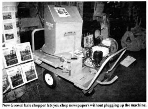 "As far as I know it's the first bale chop-per specifically designed to chop newspapers for bedding. It works great," says Rusty Leffingwell, manufacturer's representative for Kasco Mfg., a Shelbyville, Ind., distributor.