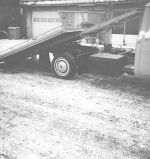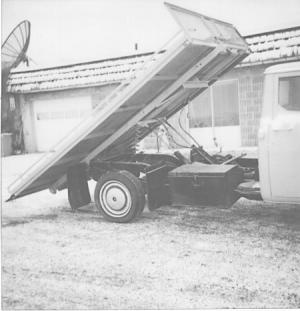"I made a 5-ft. (2-in. dia.) cylinder to push the bed back 5 ft. I use two smaller cylinders off a cab-over Freightliner to raise and lower the bed. I use a small Vickers hydraulic pump with electric clutch to run the hydraulics, and I put a joy stick on the two valves. Controls are on the right-hand side below the bed."