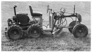 He spent 2 to 3 years building it in his spare time. "It's powered by an old International 1-cyl. hopper water-cooled engine rated at 1 1/2 to 2 1/2 hp. Maxi-mum pulley speed is 500 rpm's. The gearbox is a 6-speed Wheel Horse transaxle, and the wheels also came off a Wheel Horse. The hydraulic pump is at the rear of the machine, powered by a V-belt off the engine.