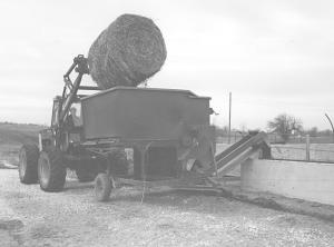 Home Built Bale Processor HAY & FORAGE HARVESTING Bale Handling (5) 21-2-7 "Compared with the big round bale feeders we used before, we figure it easily saves us a half bale a day in wasted hay," says Harvey Lorton about the big bale processor/feeder he and his sons, Dan and Gary, built from scratch to feed round bales into fenceline feeders.