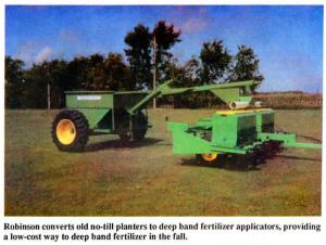 "We specialize in custom designing a variety of products for no-till and ridge till farmers, including liquid caddies. But this dry fertilizer caddy is our hottest product," say Randy Helmrich, owner. "Most no-till planters have limited dry fertilizer capacity. For example, a Deere 6-row 30-in. planter holds only 2,100 lbs. of dry fertilizer so if you apply 200 lbs. per acre you can only go 10 acres before you have to refill. Our 5-ton caddy lets you plant 50 acres per fill. Pulling the caddy takes weight off the tractor, keeping compaction to a minimum. The large 15.5 by 22.5 tires make the cart easy to pull and maneuver. Width can be adjusted from 120 to 78 inches so it can be used in wide or narrow rows." Helmrich says some customers pull the caddy behind old no-till planters that they convert to deep band fertilizer applicators. "It's a low-cost way to deep band fertilizer in the fall," says Helmrich. "We converted an old Deere 1300 conservation planter and do custom work with it. We stripped the seed boxes off and left the fertilizer boxes on, then added a toolbar in front and mounted no-till coulters on it. Old IH 400 Cyclo planters work even better because they're built with a toolbar in front."