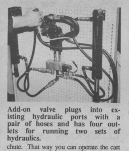 "It eliminates the need to constantly climb off the tractor to switch hoses and it's much less expensive than a modification of the tractor hydraulic system," says Martin Derks of Shelmar Products, who notes that the diverter valve could also be mounted directly onto any piece of equipment that requires double hydraulics, such as a large grain cart that has a hydraulically controlled auger and unload chute. That way you can operate the cart with any tractor that's equipped with one double-acting valve.