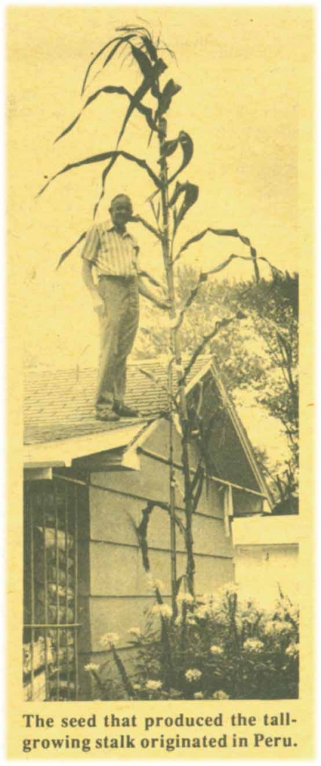 The towering stalk surpassed the previous record stalk of 20 ft.,1 1/2 in., grown by Howard Johnson, Anita, Iowa (See Vol. 8, No 2). Muerman's record stalk got special treatment in a plot next to the house. He kept it watered and fertilized heavily, especially toward the end of the growing season. A long cane fishpole provided support for the growing stalk, which would not have been able to stand on its own. The stalk formed just one tiny ear that didn't mature.