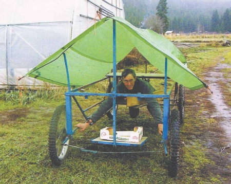 "You lie down on it and pedal with both feet," he explains. "It's a low-tech machine with an 18 by 4-ft. plywood shelf across the rear for hauling planting material, harvested crops, or just extra weight for traction."