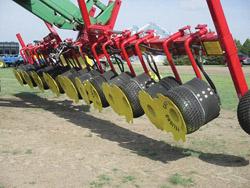 The Bourquin weed puller’s tires pull tall-growing weeds from low growing crops. The machine went out of production in the 1980’s when Roundup-ready crops caught on. It was re-introduced a few years ago when Roundup resistant weeds started developing. A row of wheels, which are driven hydraulically, rotate against each other, grabbing weeds which extend above the crop row.