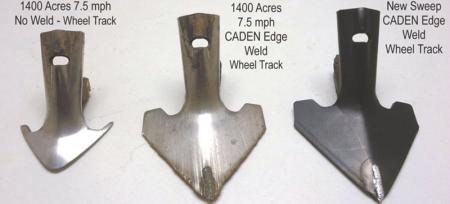 Manthey says the patented CADEN Edge manufacturing process uses robotic equipment to infuse a fine bead of tungsten carbide into the tips and leading edge of shovel sweeps.  That ultra-tough surface resists abrasion, unlike the OEM shovels that quickly show signs of wear, especially on shanks behind the wheels or on the front row of a field cultivator.