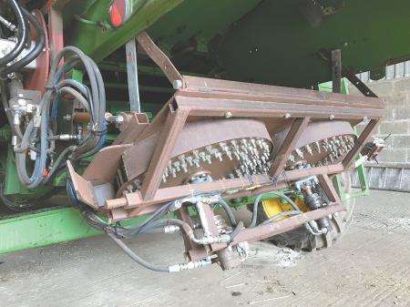 So Buckland devised a "pin mill" system that consists of two sets of discs fitted with extended 3-in. bolts.  One disc of each pair spins while the other is static.  Seeds are crushed between the discs before they're thrown out the back of the combine together with the chaff.  There are 3 rings of bolts on the rotating discs and 2 rings on the static side.