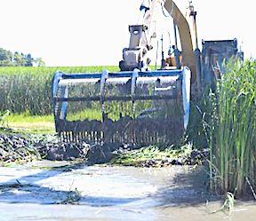 One of the advantages is as vegetation is removed, it can be simply dropped on shore. Once out of the water, it dies and breaks down and can later be used as fill.