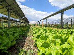 One benefit of agrivoltaics is a cooler microclimate for crops, with less water evaporation from the soil. Sprout City Farms operates 2 1/2 acres under the arrays. Kominek says the farm reports equal yields with half the water compared to full sun vegetable production.