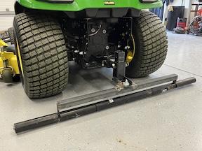 He used an adjustable, step-down trailer hitch to mount it to the garden tractor’s receiver hitch. Hanuszak bolted the hitch to the angle iron. He reinforced the connection by welding two short pieces of angle iron to either side of the hitch.